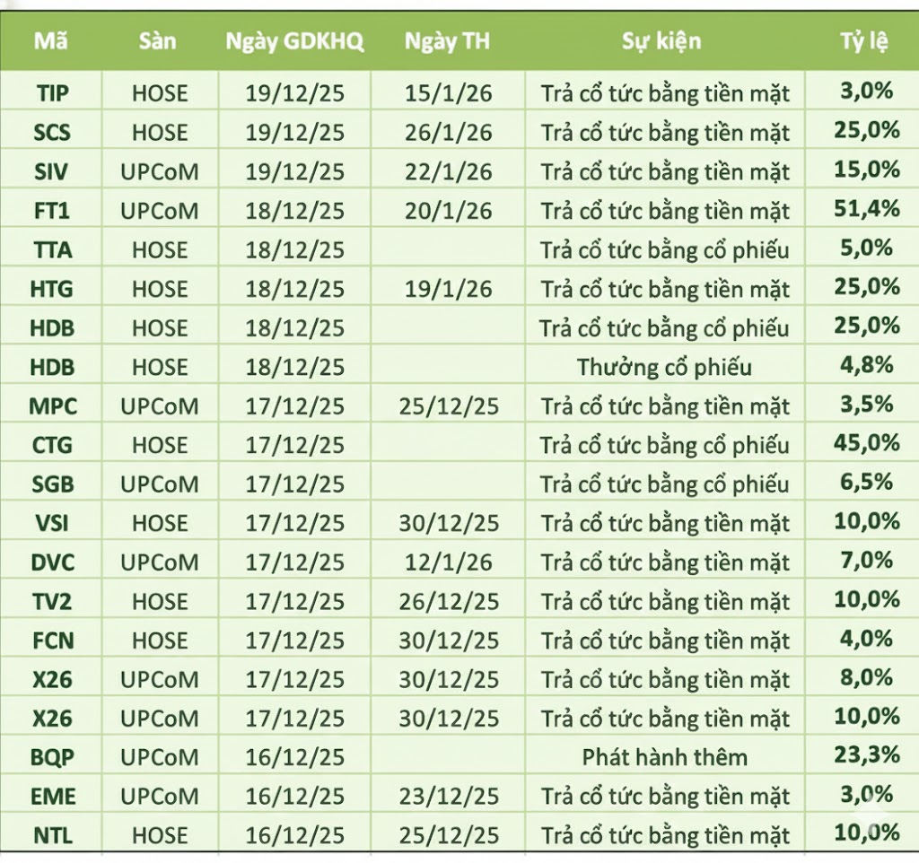 Ngoài ra, trong danh sách trên, cái tên đáng chú ý khác là Ngân hàng TMCP Công Thương Việt Nam (VietinBank - mã: CTG) chốt danh sách cổ đông vào ngày 18/12/2025 để phát hành cổ phiếu trả cổ tức từ nguồn lợi nhuận còn lại năm 2021, 2022 và giai đoạn 2009 - 2016.