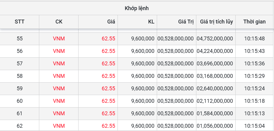 Chỉ trong khoảng 10h14 – 10h16, hơn 96,09 triệu cổ phiếu VNM đã được chuyển nhượng gọn gàng với mức giá "đỏ chót".