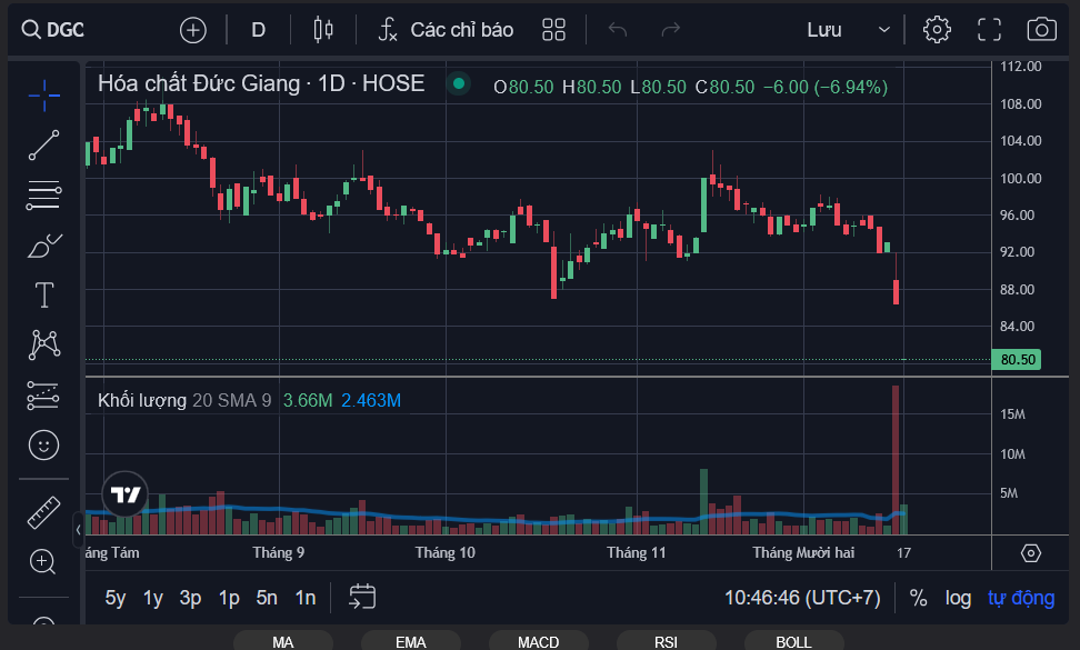 DGC giảm sàn 2 phiên liên tiếp trong bối cảnh doanh nghiệp chuẩn bị tạm ứng cổ tức tiền mặt năm 2025 tỷ lệ 30%, 1 cổ phiếu được nhận 3.000 đồng. Với gần 380 triệu cổ phiếu đang lưu hành, Hóa chất Đức Giang dự chi khoảng 1.140 tỷ đồng để thanh toán cho cổ đông. Ngày 25/12 sẽ là ngày đăng ký cuối cùng lập danh sách cổ đông. Thời gian thanh toán dự kiến vào ngày 15/1/2026.