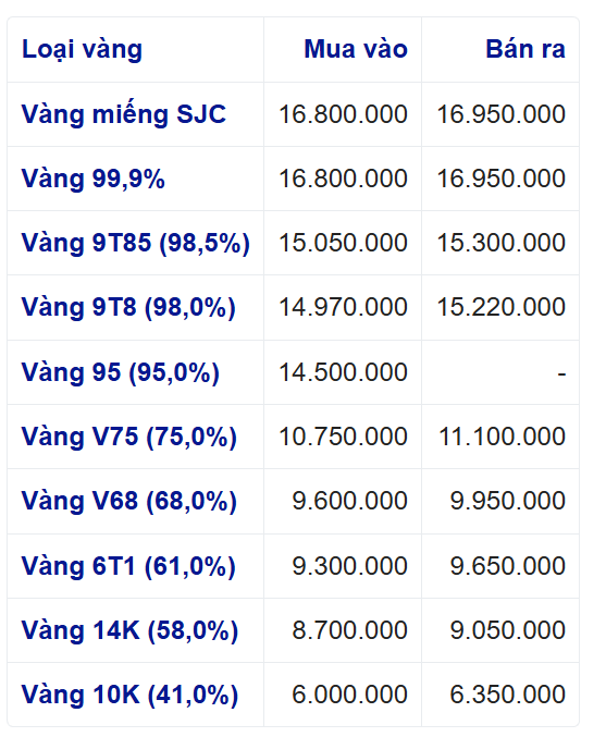 - Vàng miếng SJC: 167,2 – 169,7 triệu/lượng, bay gần 1 triệu so với hôm qua