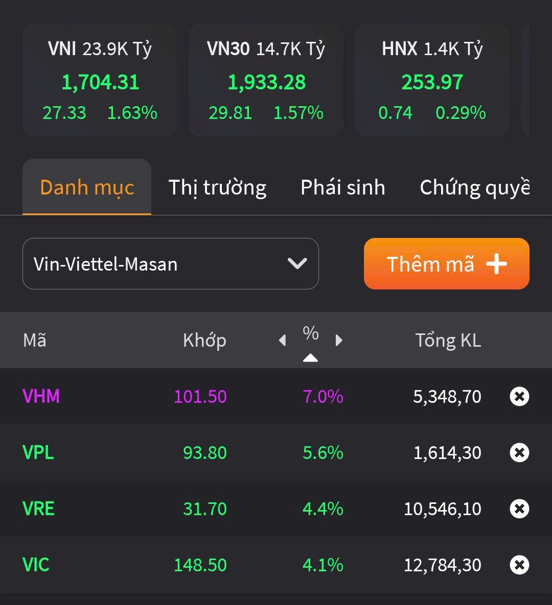 Hiệu ứng lan tỏa giúp VRE tăng 4,4% và VIC tăng 4,1%, tạo thành bộ ba trụ đỡ vững chắc cho thị trường.