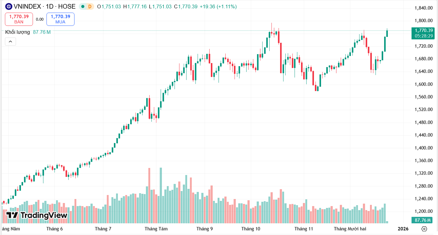 Trước đó, trong phiên giao dịch ngày 22/12, VN-Index tăng gần 47 điểm (+2,74%), vượt mốc 1.750 điểm và áp sát đỉnh lịch sử hồi giữa tháng 10. Đây là phiên tăng mạnh nhất của chỉ số kể từ khi FTSE Russell thông báo nâng hạng thị trường chứng khoán Việt Nam vào ngày 8/10.