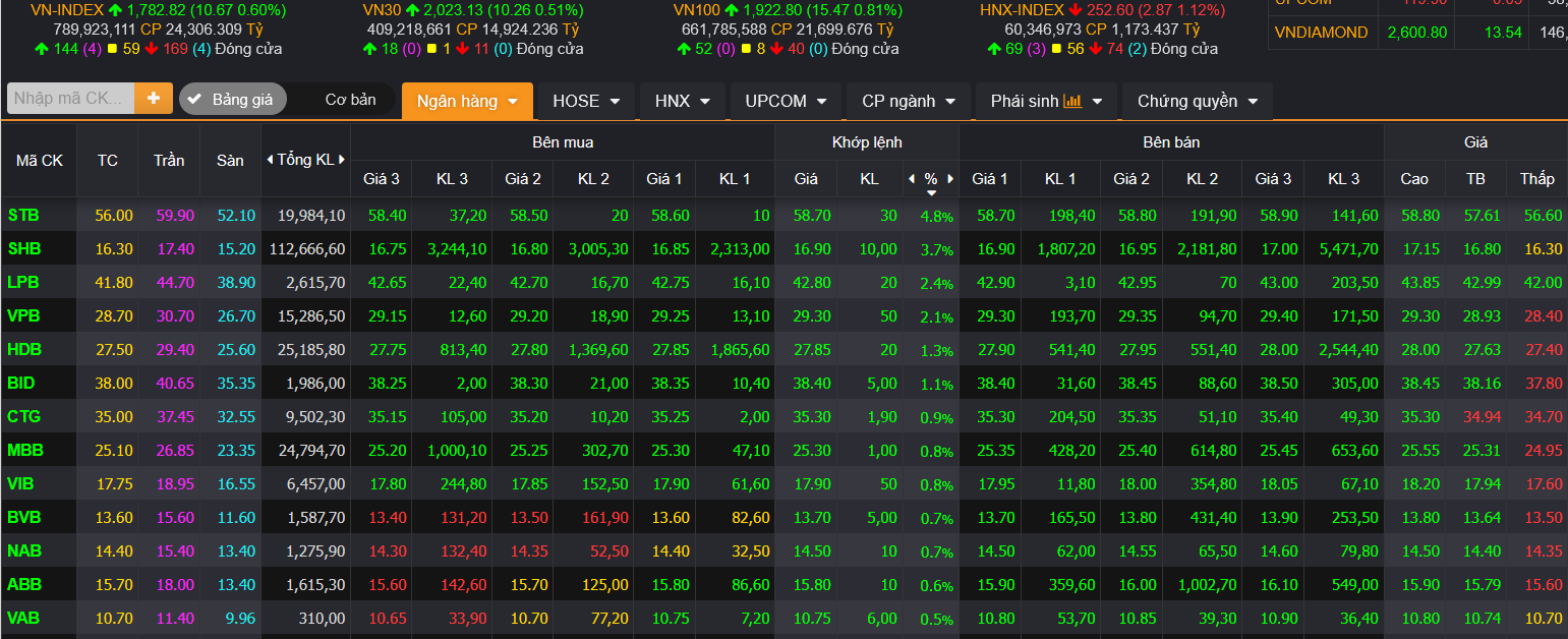Đồng thời, nhiều mã ngân hàng khác như VPB, SHB, BID, CTG, MBB, HDB cũng thể hiện sự đồng thuận trong phiên này.
