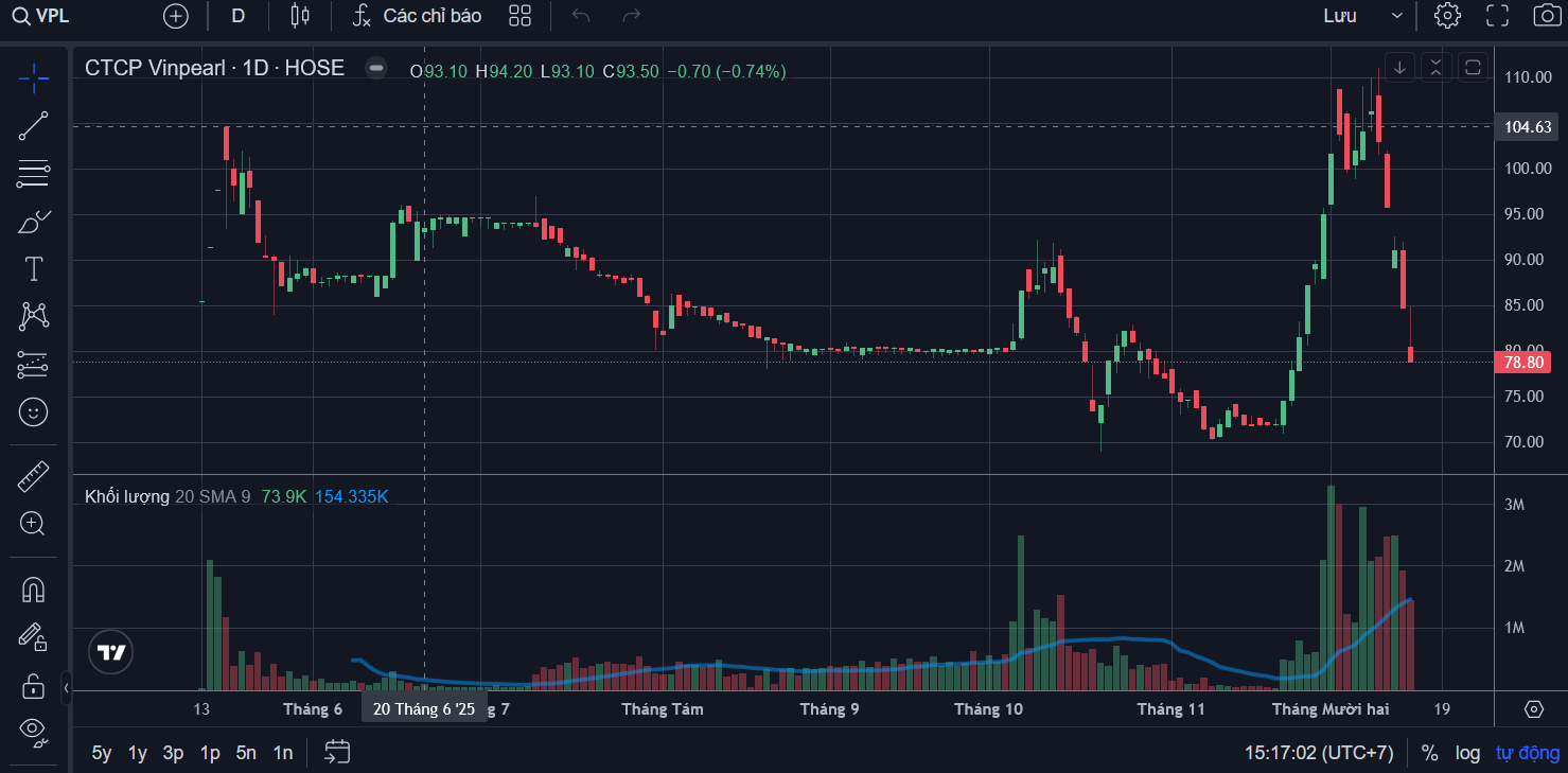 Bức tranh phân hóa rõ nét: VRE bật tăng 5,3% lên 28,9 nghìn/cp, trong khi VPL tiếp tục thêm một cây sàn, lùi về 78,8 nghìn/cp. Chỉ sau hơn một tuần, VPL đã “bốc hơi” tới 40% thị giá – con số đủ khiến nhiều nhà đầu tư mất ngủ.