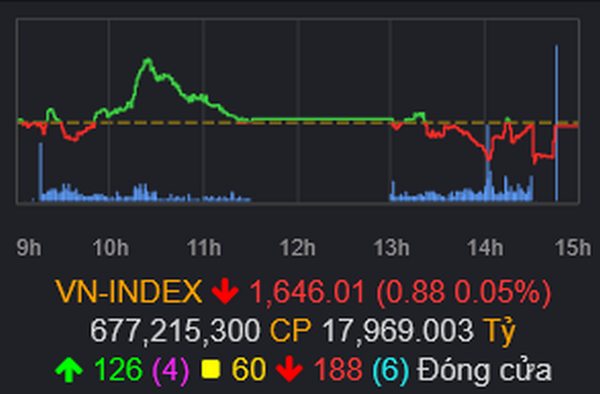 Đóng cửa, VN-Index dừng ở 1.646 điểm, giảm nhẹ 0,88 điểm (-0,05%). Sau 4 phiên rơi thang máy, ít nhất thị trường cũng đã tạm dừng đà lao dốc.