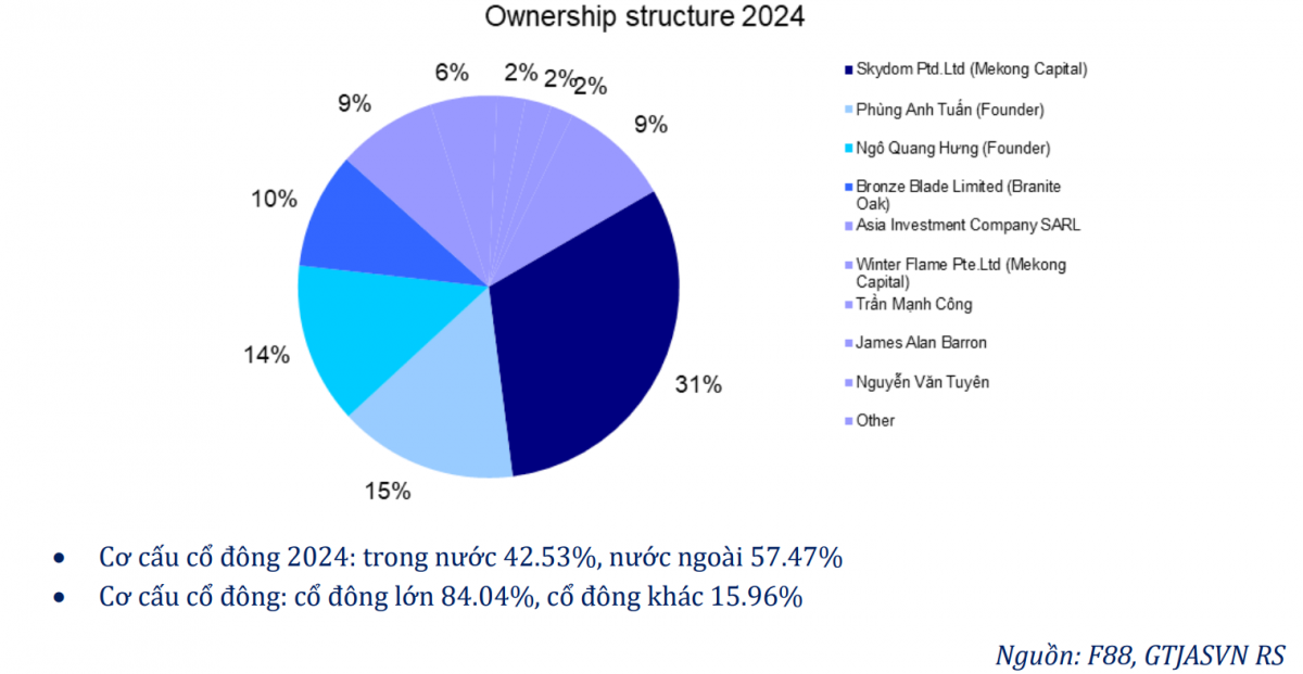 Theo dữ liệu công bố, cổ đông lớn nhất tại F88 là tổ chức Skydom Pte. Ltd (thuộc Mekong Capital) với tỷ lệ nắm giữ 31,32% vốn điều lệ.