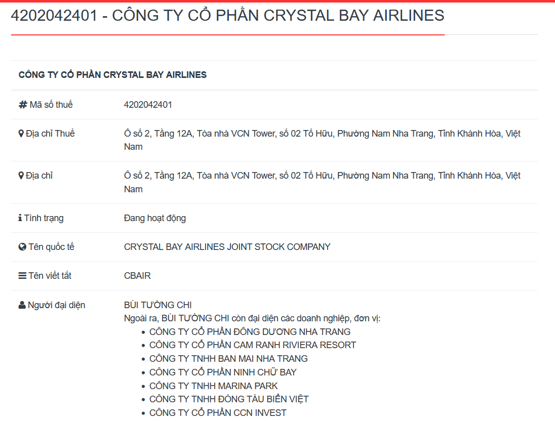 Theo đăng ký kinh doanh, Crystal Bay Airlines có tên đầy đủ là CTCP Crystal Bay Airlines (CBAIR).