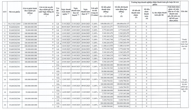 - Chi hàng trăm tỷ trả lãi trước hạn cho 13 lô trái phiếu gồm PLCCH2124001 và nhóm PLR05202301 – PLR05202312, lãi suất 11%/năm.