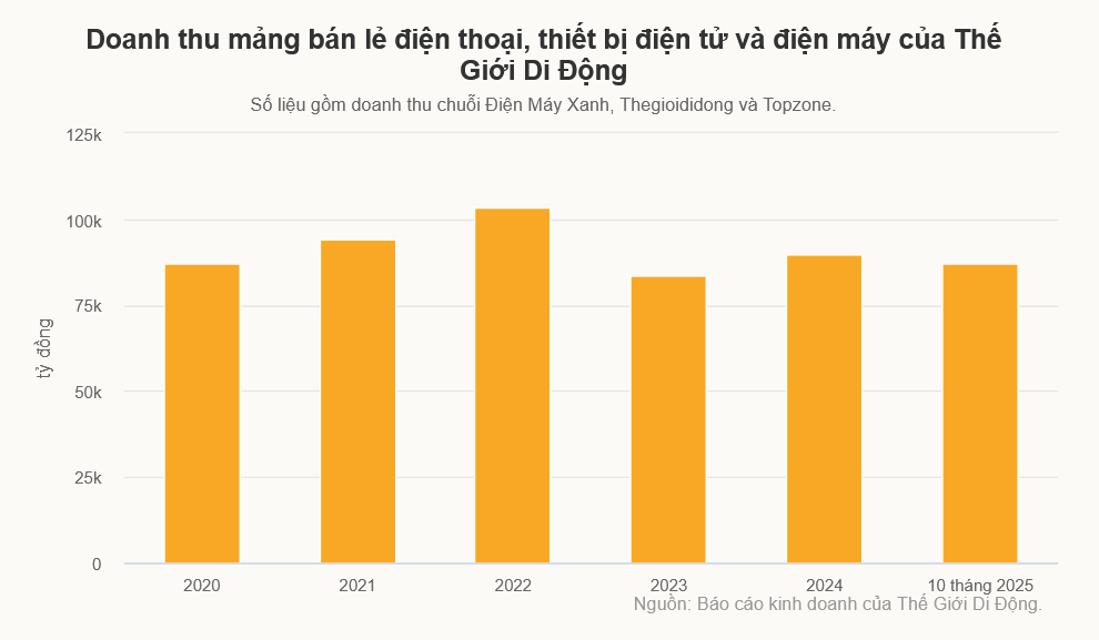 Về kết quả kinh doanh, 10 tháng đầu năm, mảng bán lẻ điện thoại, thiết bị điện tử và điện máy đem lại doanh thu gần 87.000 tỷ đồng, tăng 17% so với cùng kỳ. Mảng này đóng góp gần 68% vào tổng doanh thu của Thế Giới Di Động.