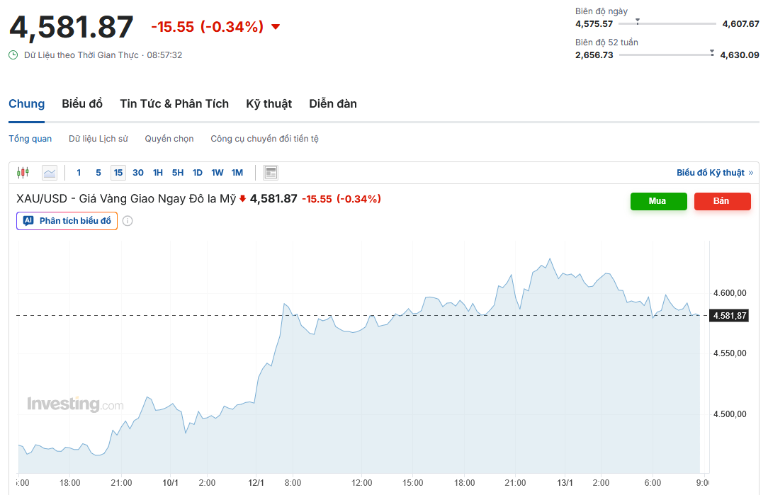 Sau khi lập đỉnh lịch sử 4.626,6 USD/oz, giá vàng thế giới lùi nhẹ về 4.595 USD – một nhịp điều chỉnh rất bình thường sau khi tăng quá nóng.