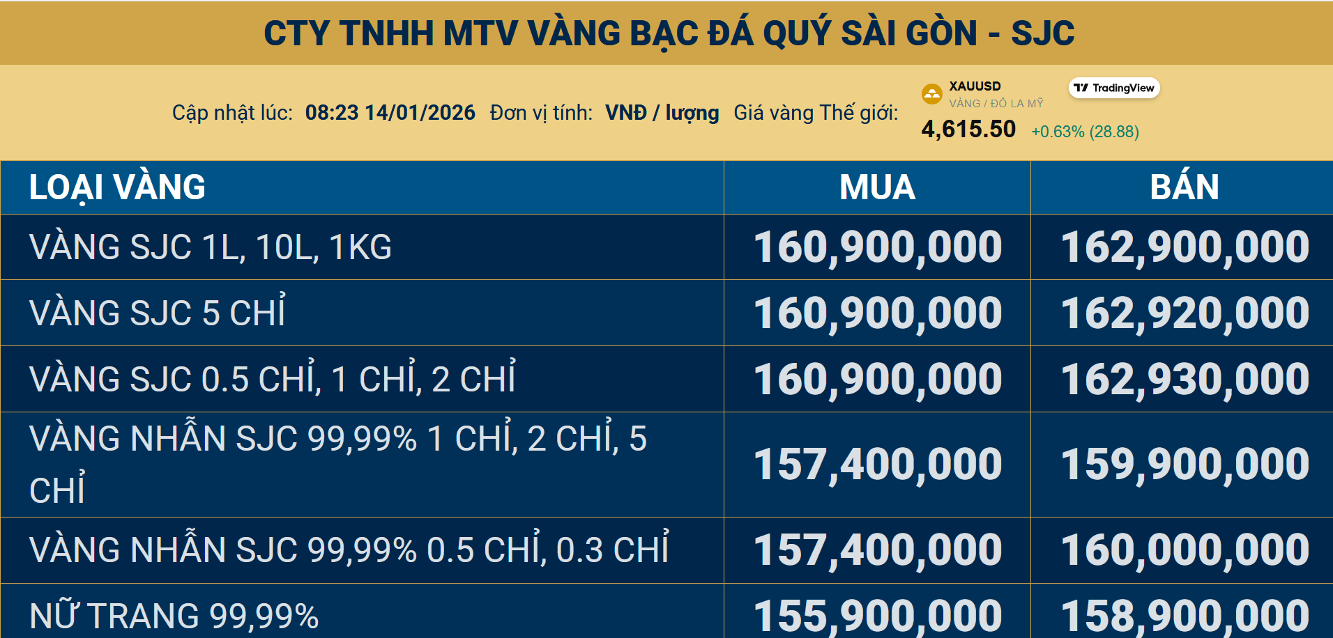 Đồng thời, giá vàng nhẫn 9999 tại SJC cũng đã được điều chỉnh tăng thêm 900.000 đồng/lượng, lên 157,4-159,9 triệu đồng/lượng hai chiều mua vào - bán ra.