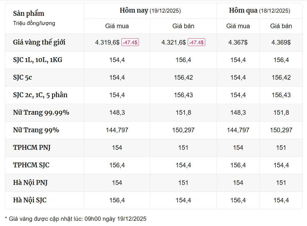Giá vàng thế giới sáng nay giảm nhẹ. Lúc gần 9h sáng ngày 19/12 (giờ Việt Nam), giá vàng thế giới giao ngay ở mức 4.334,2 USD/ounce, giảm 19,8 USD/ounce so với đêm qua.