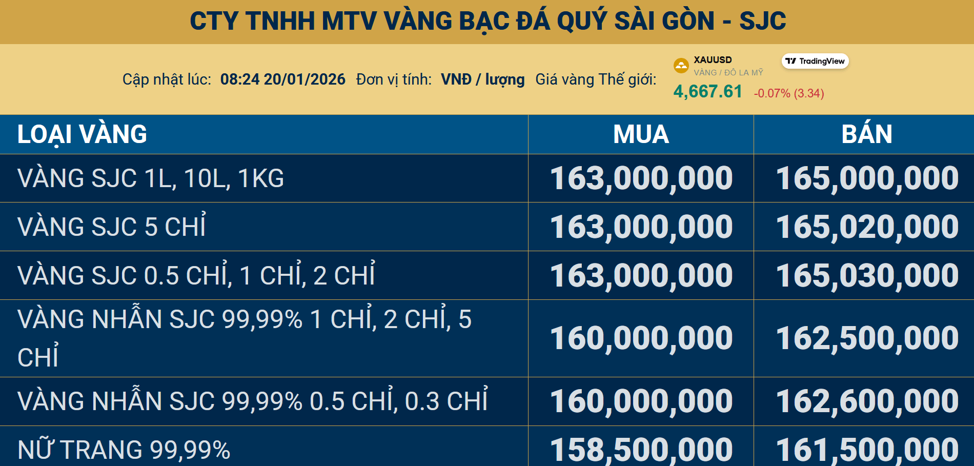 Giá vàng thế giới giảm 2 USD mỗi ounce, xuống 4.670 USD. Trong phiên giao dịch Mỹ (đêm 19/1), kim loại quý tăng lên mức cao kỷ lục 4.683 USD rồi nhanh chóng đảo chiều đi xuống.