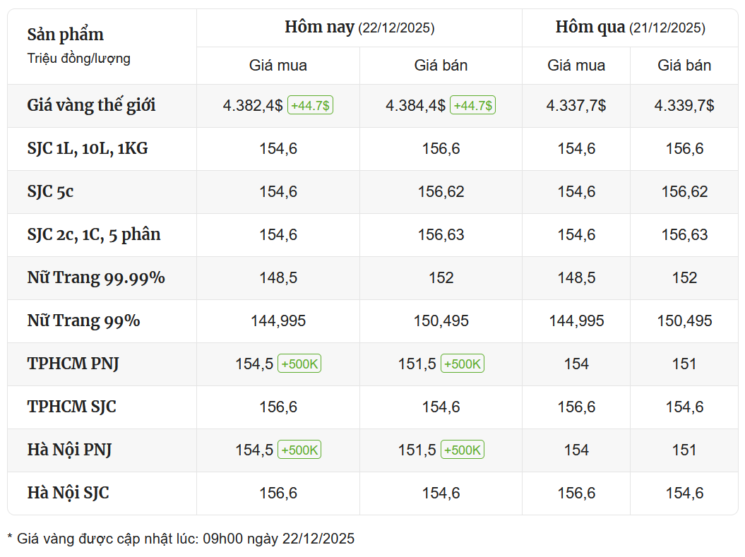Tại Doji (Hà Nội & TP.HCM), vàng miếng SJC giao dịch quanh 154,6 – 156,6 triệu đồng/lượng (mua – bán), đứng giá so với hôm qua.