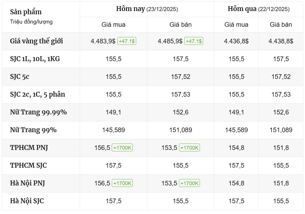Còn tại tại hệ thống Mi Hồng, giá vàng nhẫn và vàng miếng tiếp tục tăng thêm 300.000 đồng/lượng ở chiều mua vào và giữ nguyên ở chiều bán ra, hiện đồng loạt giao dịch quanh 156,3 – 157,5 triệu đồng/lượng.