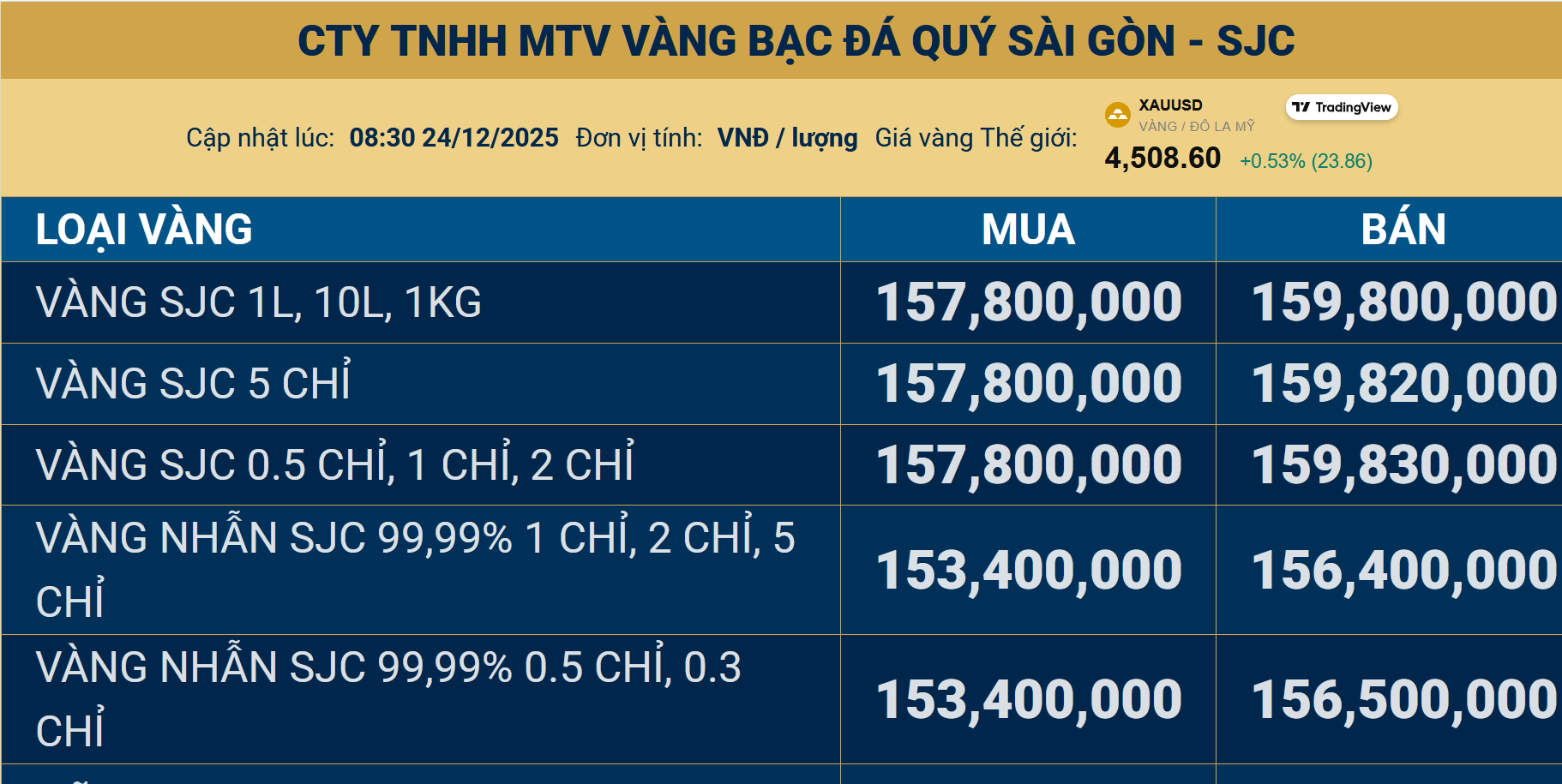 Giá vàng miếng trong nước sáng 24/12 được các công ty kinh doanh vàng niêm yết quanh mức 159,8 triệu đồng/lượng ở chiều bán ra, tăng 800 nghìn đồng/lượng so với chốt phiên hôm qua.
