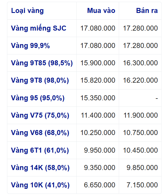 - Vàng nhẫn 9999 (1–5 chỉ): 169,6 – 172,6 triệu đồng/lượng (chỉ thấp hơn đúng 200k/lượng – gần như ngang kèo!)
