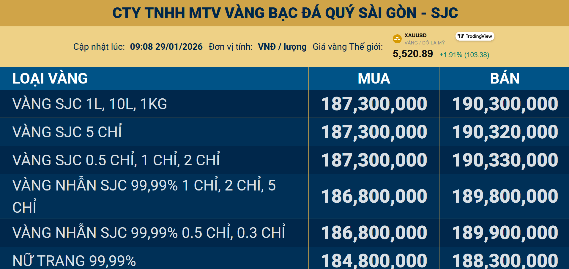 Tương tự, tại PNJ và DOJI, vàng nhẫn 9999 được mua vào 186,8 triệu đồng, bán ra 189,8 triệu đồng, tăng 6,8 triệu đồng...