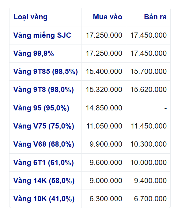 Ở phân khúc vàng nhẫn 99,99%, giá giao dịch phổ biến ở mức 171,3 – 174,3 triệu đồng/lượng.