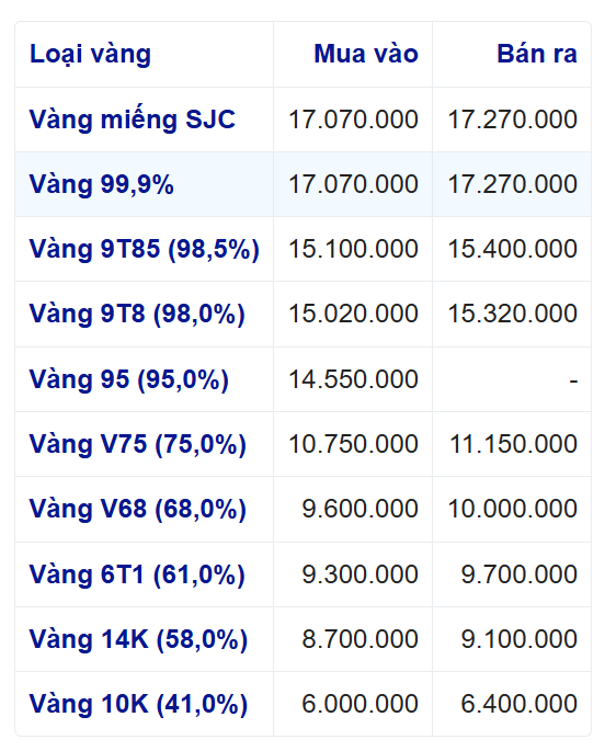 - Mi Hồng: niêm yết 170,7 – 172,7 triệu đồng/lượng, nhỉnh hơn ở chiều mua vào nhưng lại hạ giá ở chiều bán ra.