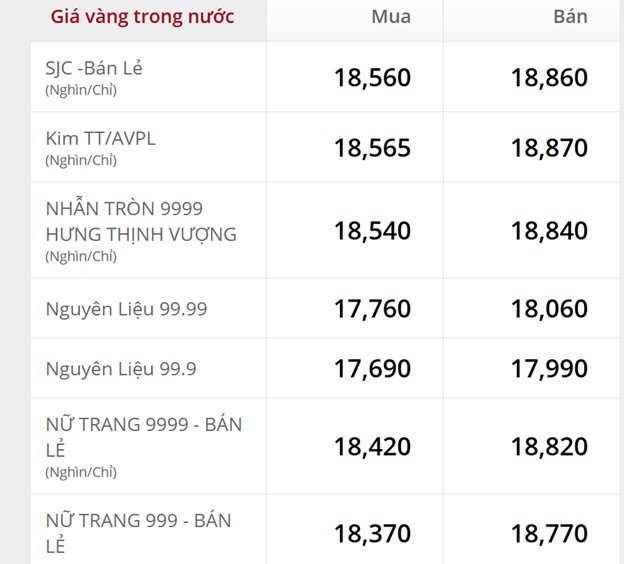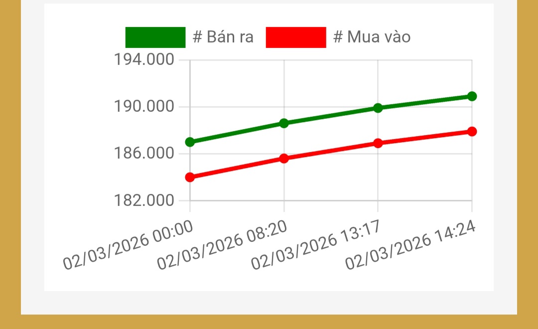 - SJC nhảy vọt lên 185,6 – 188,6 triệu đồng/lượng, tăng thẳng 1,6 triệu đồng/lượng so với cuối tuần.