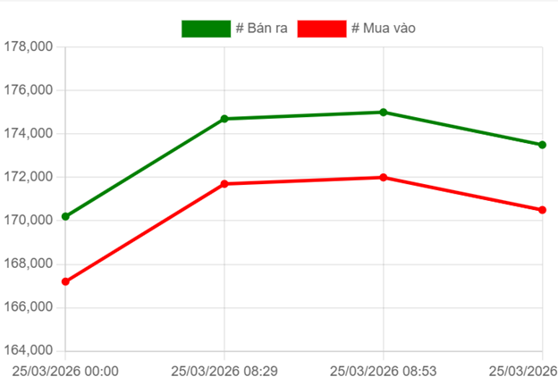 Trước đó, lúc 8h50 sáng ngày 25/3, giá vàng miếng SJC được niêm yết ở mức 171,7 – 174,7 triệu đồng/lượng, tăng thêm 4,5 triệu đồng/lượng so với chốt phiên hôm qua.