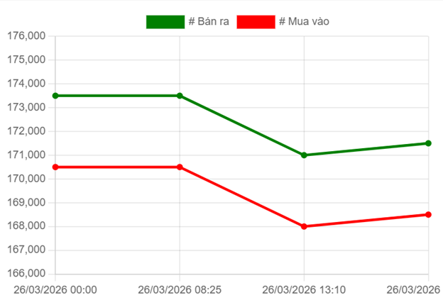 Mở cửa giao dịch sáng nay, giá vàng miếng SJC được niêm yết ở mức 170,5 – 173,5 triệu đồng/lượng, giữ nguyên so với cuối phiên chiều 25/3.