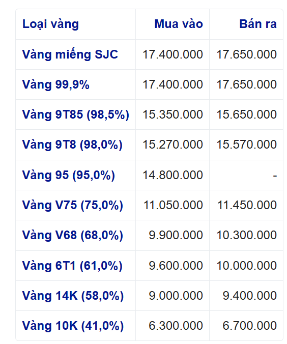 Cùng thời điểm, giá vàng nhẫn được điều chỉnh về mức 171,5 – 175 triệu đồng mỗi lượng.