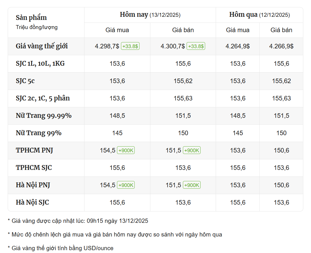Mở cửa phiên giao dịch 13/12, Công ty Vàng bạc đá quý Sài Gòn SJC niêm yết giá vàng mua vào ở mức 154,3 triệu đồng/lượng; giá bán là 156,3 triệu đồng/lượng. Chênh lệch giá mua – bán vàng SJC ở mức 2 triệu đồng/lượng.