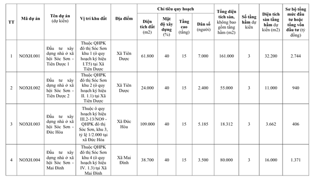 💰 Đáng chú ý, nhiều dự án sở hữu mức đầu tư “không phải dạng vừa”. Điển hình là dự án nhà ở xã hội công nghệ sạch Sóc Sơn với quy mô khoảng 300.000 m² sàn, tổng vốn hơn 5.200 tỷ đồng. Một loạt dự án khác tại khu đô thị Sóc Sơn cũng có vốn đầu tư lên tới 7.000–8.700 tỷ đồng/dự án.