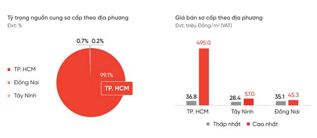 Đáng chú ý, TP.HCM tiếp tục giữ vai trò “đầu tàu” khi chiếm tới 99% tổng nguồn cung sơ cấp toàn thị trường. Trong đó, khu vực Bình Dương (cũ) vươn lên dẫn đầu với khoảng 53% nguồn cung, tập trung chủ yếu tại Thuận An và Dĩ An – hai đô thị vệ tinh đang nổi lên như các điểm nóng phát triển hạ tầng – đô thị phía Đông Bắc TP.HCM.