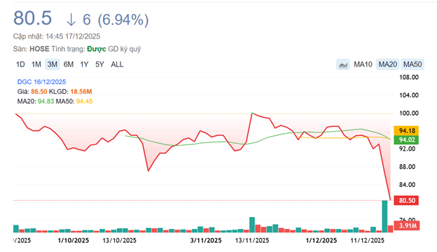 📉 Phiên 17/12, DGC tiếp tục “rơi tự do” trong cảnh trắng bên mua, nối dài cú sập từ phiên trước đó – nơi thanh khoản đã lên mức kỷ lục. Giá cổ phiếu hiện đã lùi sát vùng đáy hồi đầu tháng 4 (thời điểm thị trường chịu tác động thuế quan).