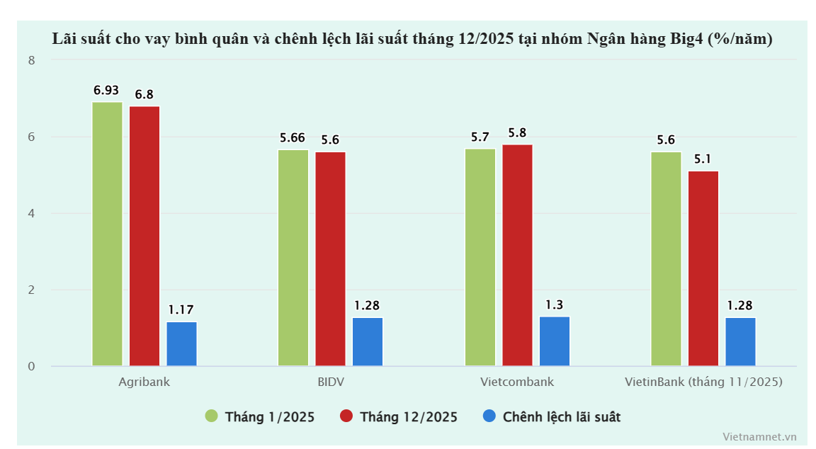 Tại Vietcombank, lãi suất cho vay bình quân tháng 12/2025 là 5,8%/năm, tăng 0,1%/năm so với tháng 11 và đầu năm 2025. Chênh lệch lãi suất tiền gửi và cho vay bình quân tại Vietcombank là 2,8%/năm, trong đó chênh lệch lãi suất sau khi trừ các chi phí liên quan hoạt động, huy động, sử dụng vốn là 1,3%/năm.