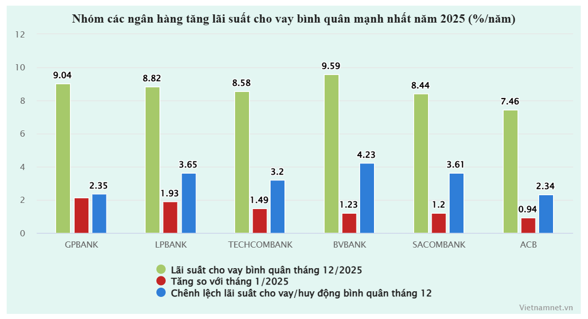 Ở chiều ngược lại, một số ngân hàng ghi nhận lãi suất cho vay bình quân tháng 12/2025 giảm so với đầu năm gồm: PGBank giảm 0,01%/năm, OCB giảm 0,04%/năm, BIDV giảm 0,06%/năm, Viet A Bank giảm 0,36%/năm, Saigonbank giảm 0,53%/năm, BaoViet Bank giảm 1,75%/năm.