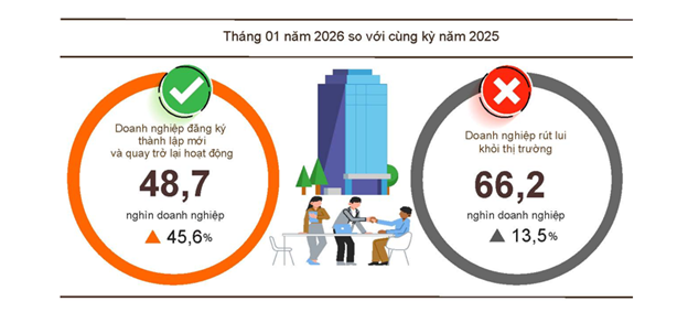 Như vậy, tháng đầu năm nay cả nước có tới gần 48.700 doanh nghiệp thành lập mới và quay lại hoạt động – tăng hơn 45% so với cùng kỳ năm 2025.
