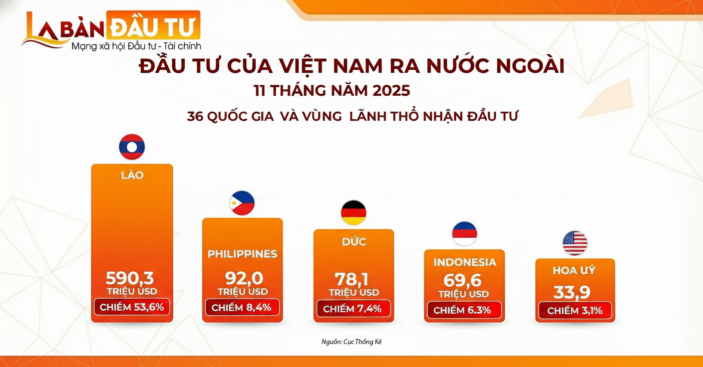 Trong 11 tháng năm 2025, có 36 quốc gia và vùng lãnh thổ nhận đầu tư của Việt Nam. Trong đó, Lào tiếp tục là nước dẫn đầu với 590,3 triệu USD, chiếm 53,6% tổng vốn đầu tư.