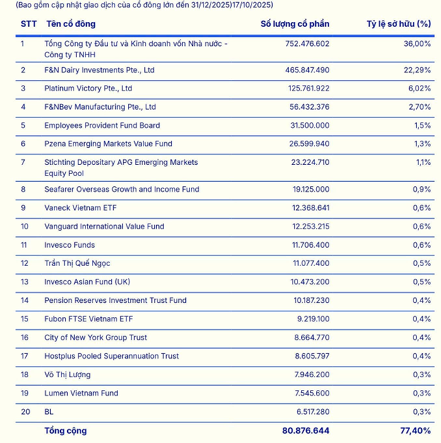 Trong khi đó, nhóm F&N tiếp tục củng cố vị thế, với tỷ lệ sở hữu đang tiệm cận ngưỡng 25%, trở thành cổ đông lớn thứ hai sau SCIC.