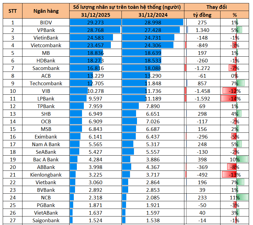 Ở chiều ngược lại, VPBank lại là ngân hàng tăng nhân sự mạnh nhất, khi bổ sung thêm 1.340 người trong năm 2025, nâng tổng số lao động lên gần 29.000 người.