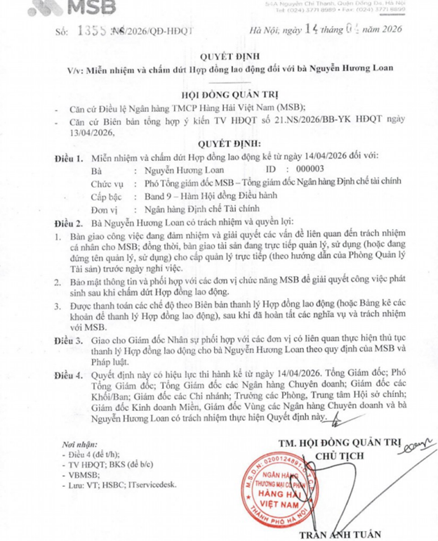 Cụ thể, ngày 14/4, MSB bất ngờ miễn nhiệm và chấm dứt hợp đồng với bà Nguyễn Hương Loan – một Phó Tổng Giám đốc thuộc nhóm điều hành cấp cao (Band 9), từng phụ trách mảng định chế tài chính. Quyết định có hiệu lực ngay lập tức, không có “độ trễ”.