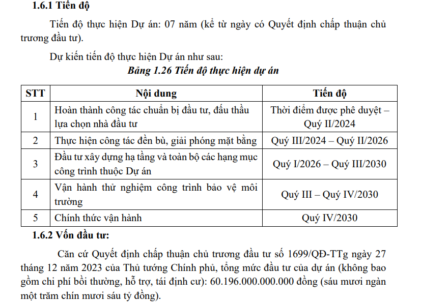 Cụ thể, giai đoạn chuẩn bị đầu tư và lựa chọn nhà đầu tư dự kiến hoàn thành trong quý II/2024. Công tác bồi thường, giải phóng mặt bằng được triển khai từ quý III/2024 đến quý II/2026. Từ quý I/2026 đến quý III/2030, dự án bước vào giai đoạn đầu tư xây dựng hạ tầng kỹ thuật và các hạng mục công trình chính.