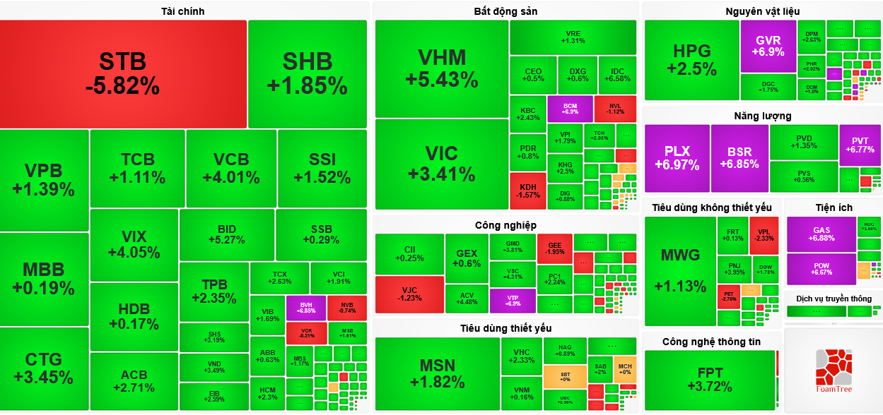Nếu không có "mảng đỏ" khá lớn từ STB - thị trường đã có sắc xanh gần như tuyệt đối và đồng thuận rộng rãi ở mọi nhóm ngành.