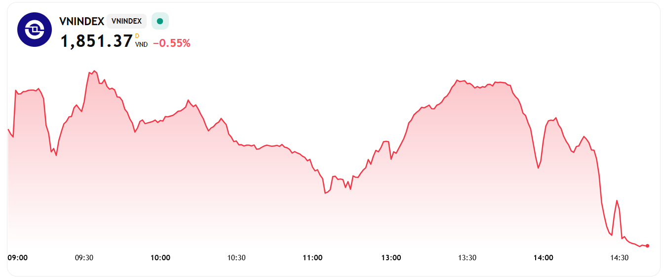 VN-Index đóng cửa giảm 6,02 điểm (-0.32%) xuống còn 1,855.56 điểm. Độ rộng thị trường không hẳn nghiêng về phía quá tiêu cực khi số mã tăng là 144 trên 183 mã giảm.