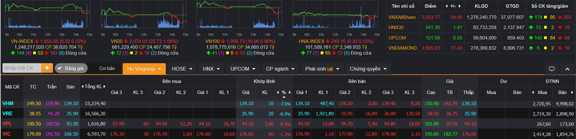 Phiên hôm nay, sau chuỗi tăng giá mạnh, bộ ba cổ phiếu họ Vin là VHM, VRE, VPL bước vào nhịp điều chỉnh dưới áp lực chốt lời và bán ròng từ khối ngoại.