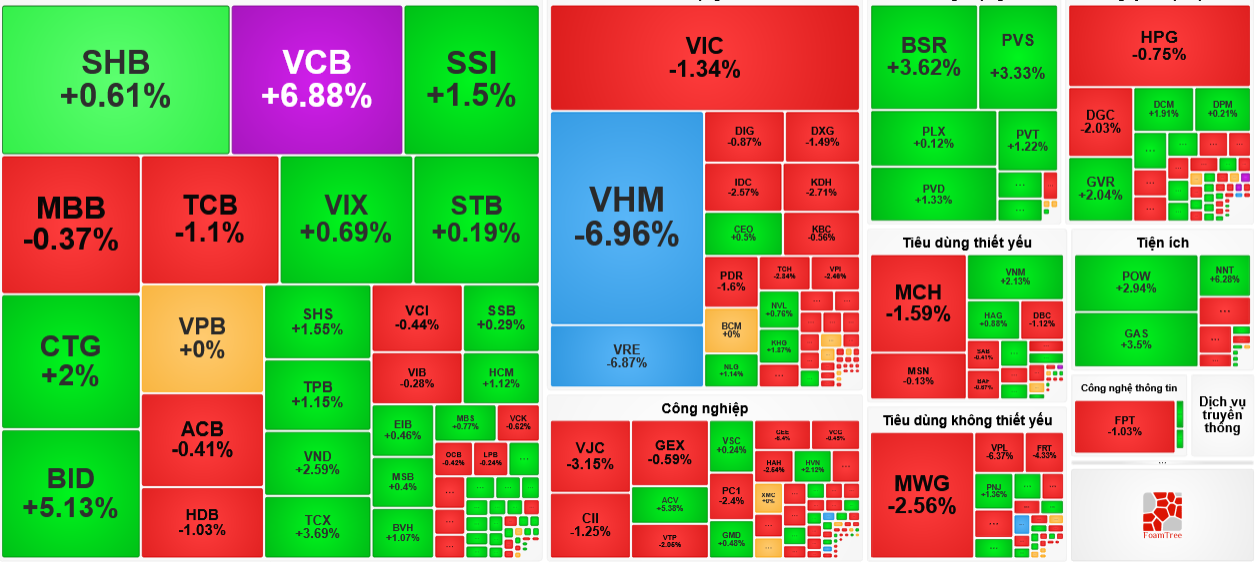 Chiều ngược lại, VCB (+6,9%), BID (5,1%) cùng với GAS (+3,5%) là 3 mã "còng lưng" gánh thị trường trong phiên quay xe này.
