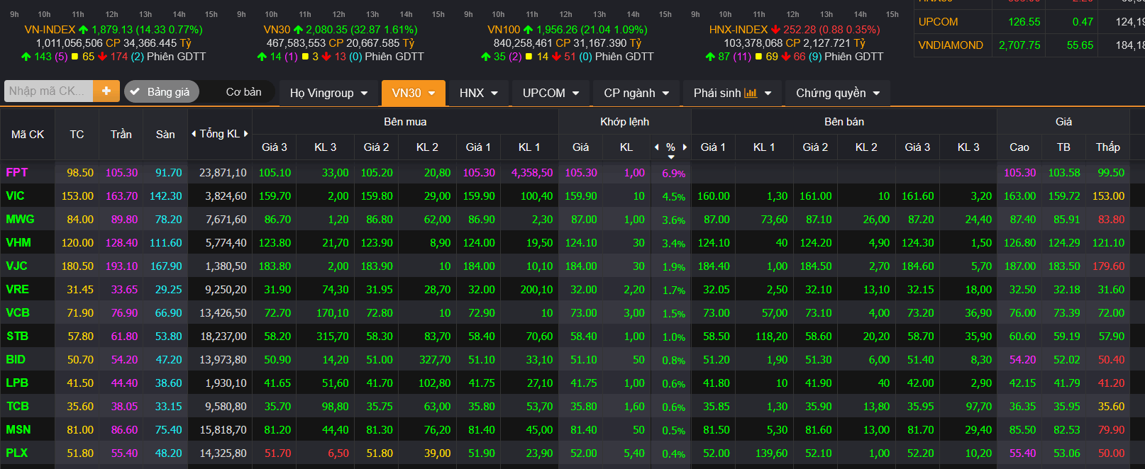 Thị trường mở đầu phiên khá phấn khởi, thậm chí, thời điểm 9h50 mốc 1.900 còn được lấy lại với sự "lên đồng" của hàng loạt mã cổ phiếu trụ - mà dẫn đầu là siêu cổ phiếu công nghệ FPT cùng đà phục hồi siêu mạnh của nhóm cổ phiếu họ nhà Vingroup.