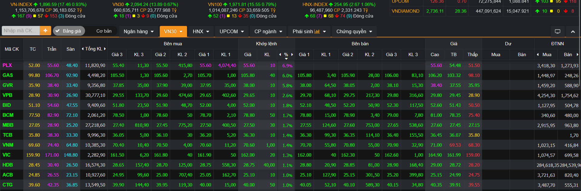 Rổ cổ phiếu VN30 hôm nay có diễn biến tích cực với 18 mã tăng giá, trong khi chỉ 9 mã giảm giá và 3 mã đi ngang. Nhiều cổ phiếu tăng mạnh như GAS tăng hơn 6%, GVR tăng 5,85%, trong khi PLX tăng kịch trần.