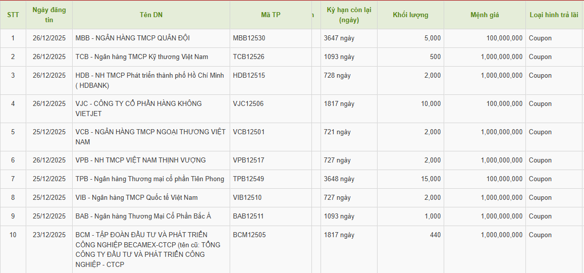 Thực tế, ngay từ đầu tháng 12, thị trường trái phiếu doanh nghiệp đã chứng kiến sự trở lại mạnh mẽ của nhóm ngân hàng. Từ các ngân hàng TMCP tư nhân như VPBank, VIB, OCB cho tới các “ông lớn” như MB, BIDV, Vietcombank, hoạt động phát hành diễn ra dày đặc, trải rộng nhiều kỳ hạn từ 2 – 7 năm.