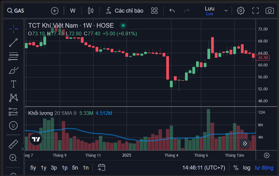 Trên thị trường, giá GAS đang trên vùng đỉnh với thị giá hơn 77.000 đồng/cp. So với mức đáy sau sự kiện "thiên nga đen" đầu tháng 4/2025, thị giá của GAS đã tăng 50%.