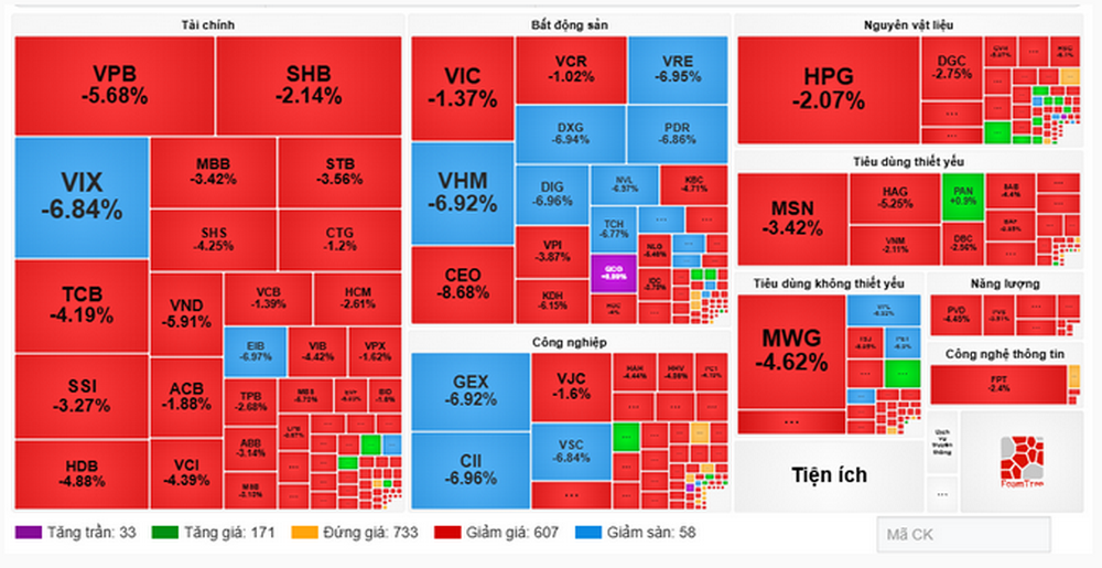 Sau buổi sáng giao dịch trong trạng thái đỏ rực, giảm 20 điểm, đến phiên chiều, lực bán tháo ngày một lan rộng trên toàn thị trường với gần 600 mã giảm, hoàn toàn áp đảo số mã tăng.