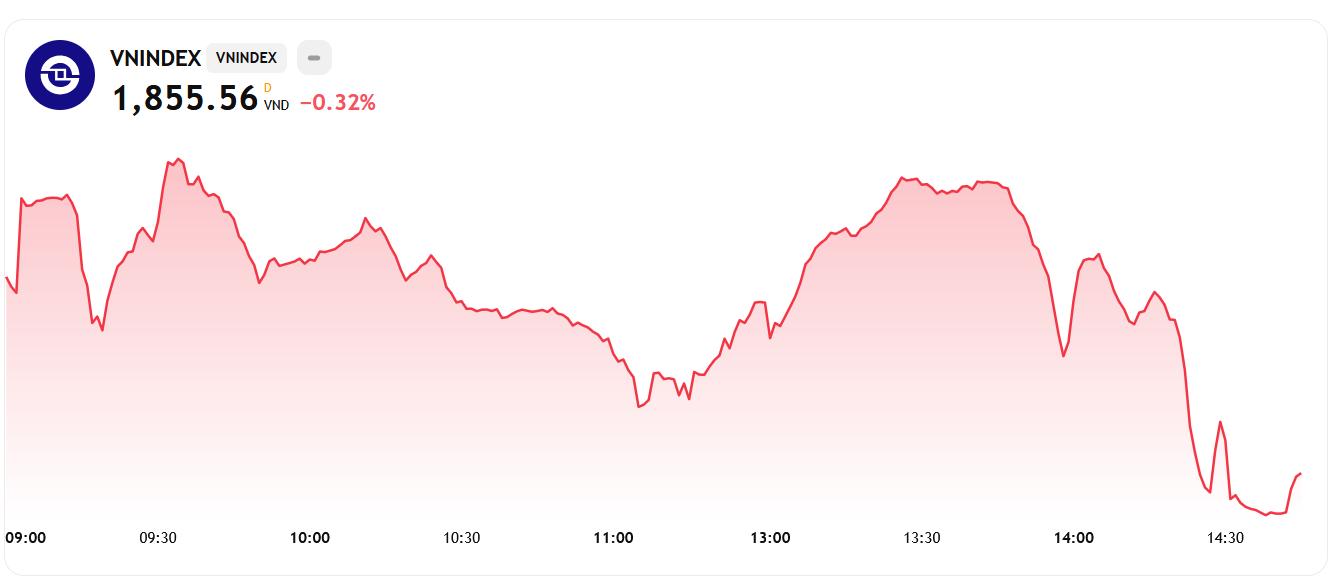 Kết phiên, chỉ số mất hơn 6 điểm (-0,32%), đóng cửa tại 1.855,56 điểm. Độ rộng thị trường không quá xấu: 144 mã tăng – 183 mã giảm.